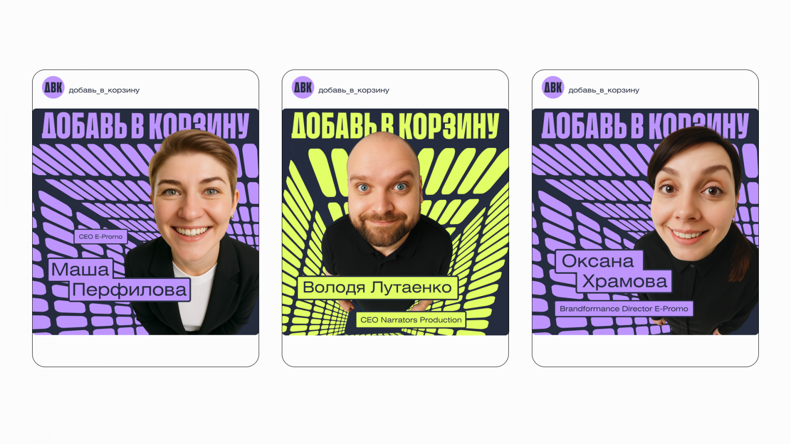 Команда создала эффект погружения: заглянул в корзину — оказался внутри мира маркетплейсов. Визуал дополнили ценниками, иконками «лайков» и «избранного» — всем, что покупатели видят ежедневно. Фото спикеров обработали нейросетями с эффектом fish-eye, который усиливал взгляд изнутри корзины.
