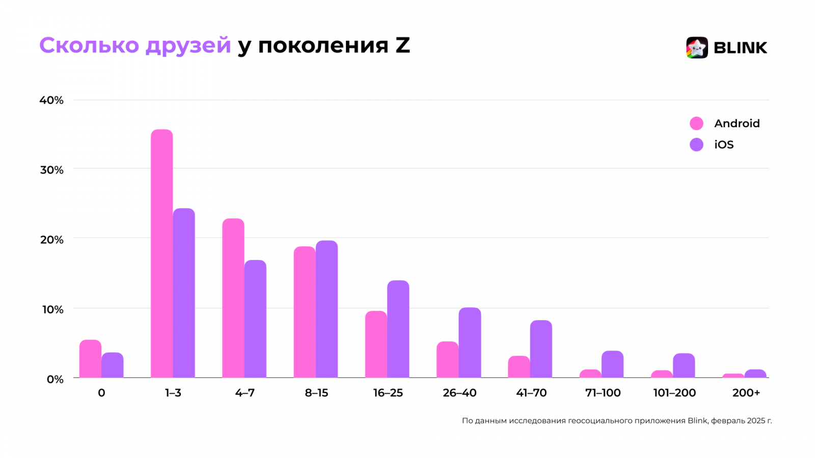 Специалисты Blink установили, сколько друзей в среднем имеют представители поколения Z. Так, 35% пользователей Android имеют не более трех друзей, в то время как среди владельцев iOS эта цифра составляет 22,7%. 21% пользователей Android и 16% владельцев iOS имеют от четырех до семи друзей, а 18% обеих групп имеют от восьми до 15 друзей.
