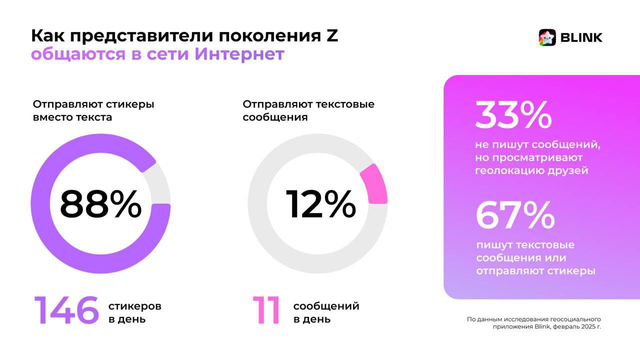 Большинство зумеров (88%) используют стикеры и эмодзи вместо текстовых сообщений, а каждый третий (33%) не пишет сообщения, а просто следит за геолокацией своих друзей. К таким выводам пришли аналитики приложения Blink, предназначенного для шеринга локаций с друзьями. Специалисты исследовали, как представители поколения Z, подростки и молодые люди в возрасте от 12 до 26 лет, предпочитают общаться и выражать симпатию друг к другу (результаты есть в распоряжении Sostav).
