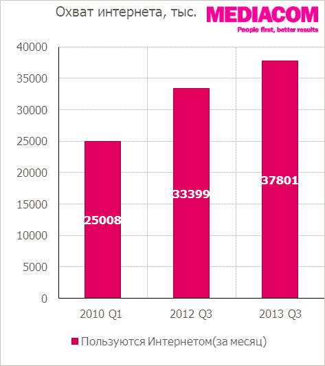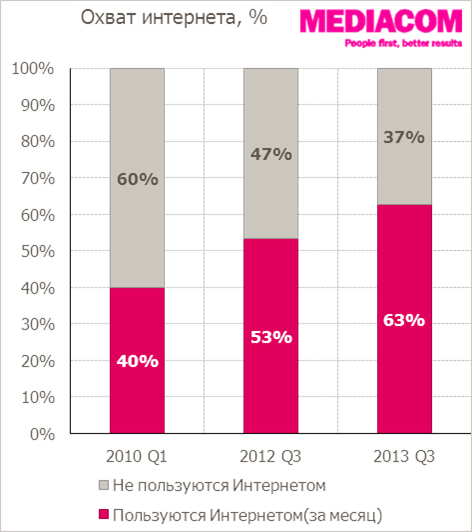 По данным TGI, в городах с населением 100000+ охват в третьем квартале 2013-го года уже достиг 63%. С олимпиад в Ванкувере и Лондоне Рунет вырос более чем на 12 и 4 млн. пользователей соответственно только в средних и крупных городах России.