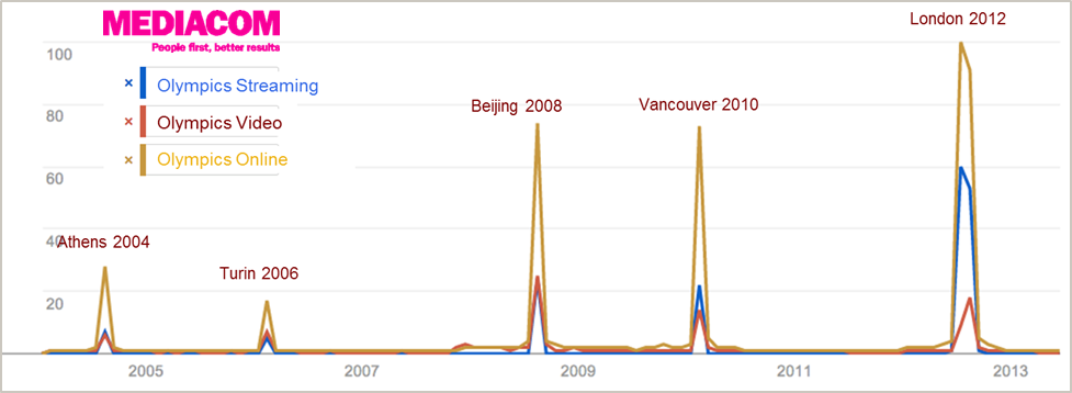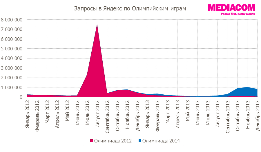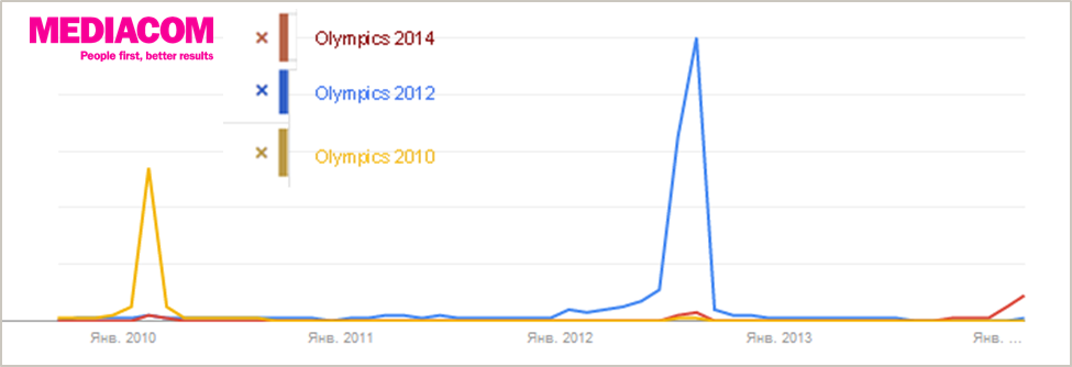 Интерес к Олимпиаде внутри страны начал появляться раньше, чем к играм в Соединенном королевстве. Так если всплеск поисков был в июле-августе 2012 года, тогда как пользователи начали искать информацию об Олимпиаде в Сочи за 3 месяца до события.