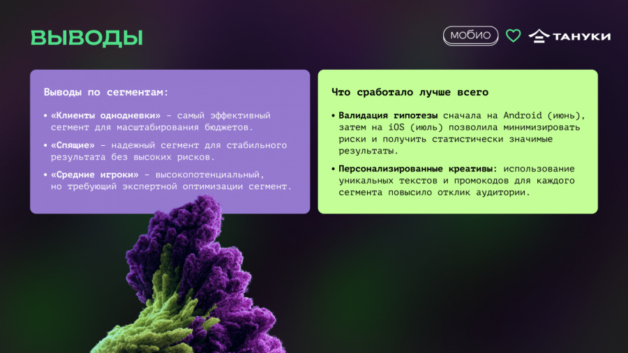 - Развить креативную стратегию: создать больше вариаций креативов для каждого сегмента, тестируя различные форматы и сообщения, в том числе с помощью ИИ.