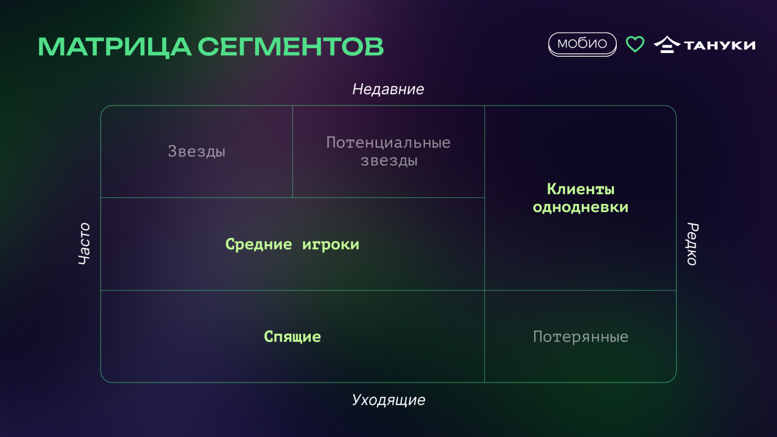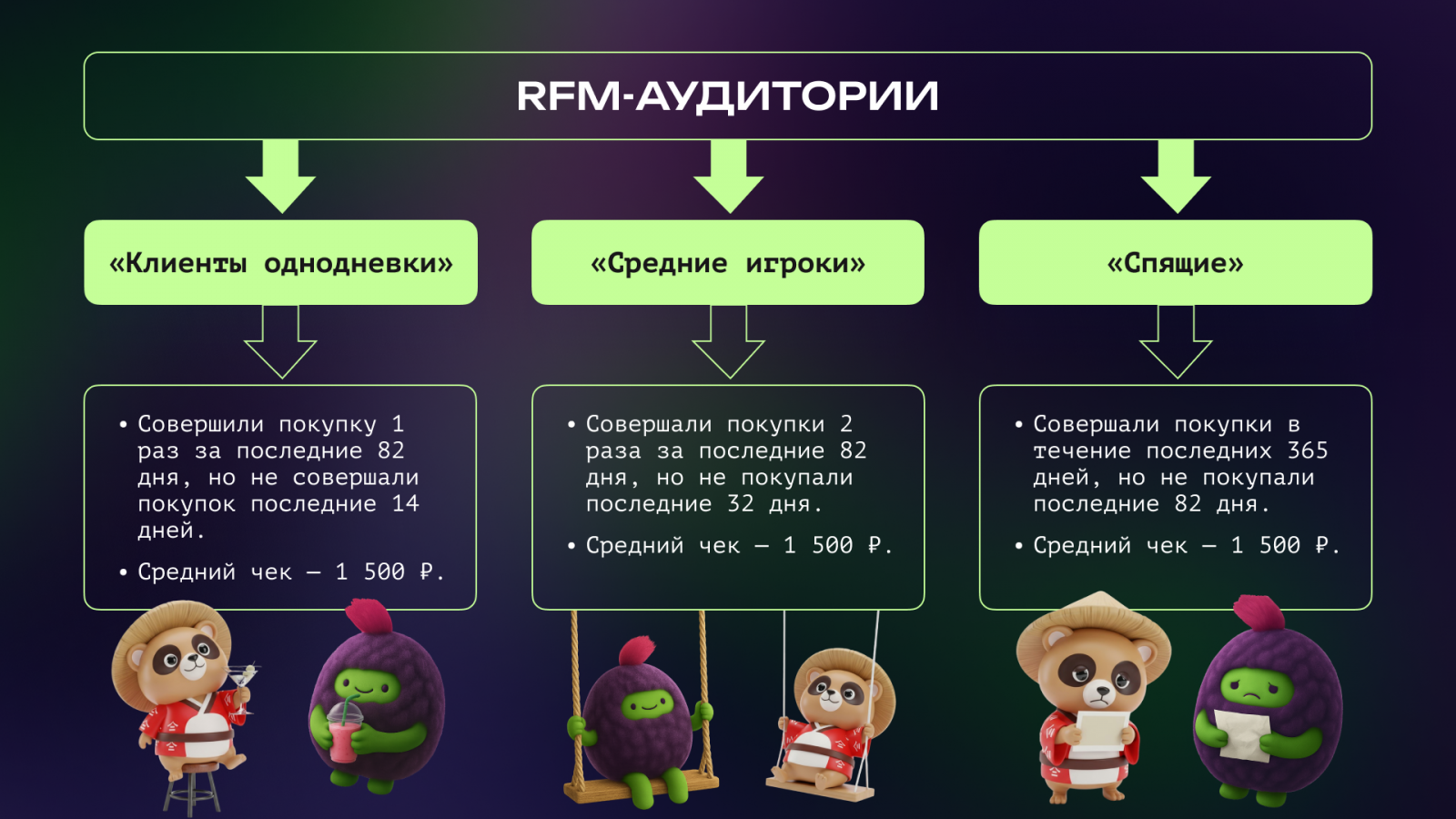 Чтобы повысить результативность, мы отказались от универсальной выборки и сфокусировались на более целевых сегментах. Для этого, используя сырые данные, провели RFM-анализ данных за год, в ходе которого разделили всю текущую аудиторию приложения на узкие сегменты.