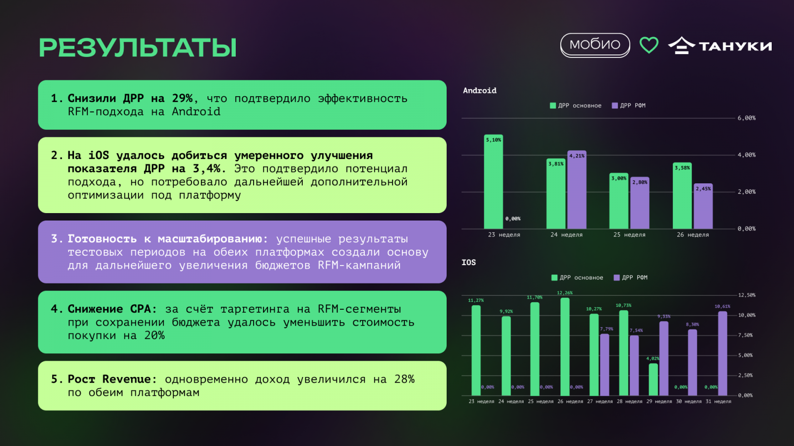 Мы особенно довольны тем, как был выстроен процесс: поэтапное тестирование гипотезы сначала на Android позволило нам минимизировать риски и уверенно масштабировать успешную стратегию на iOS. Полученные результаты — снижение ДРР и стоимости покупки при одновременном росте выручки — это именно те комплексные KPI, которые мы и хотели достичь.