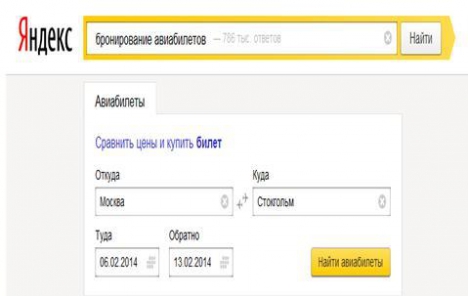 Если говорить о конкретных преимуществах интерактивного вывода результатов поисковой системы, нужно выделить возможность бронирования авиабилетов, заказ товаров без предварительного посещения интернет-магазина и т.д. Рассмотрим конкретный пример работы с обновленной бета-версией поисковой системы «Яндекс». Если вы введете в строке поиска запрос «бронирование авиабилетов», то вашему вниманию будет предоставлена следующая форма: