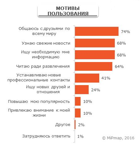 Согласно исследованию, подавляющее большинство респондентов активно использует социальные сети (в среднем 2 часа в день), преимущественно для общения с друзьями по всему миру (74%), а также для чтения новостного (68%) и развлекательного (64%) контента и установления новых личных контактов (24%). При этом почти половина (41%) респондентов расширяет круг профессиональных контактов и решает текущие рабочие задачи посредством социальных медиа.