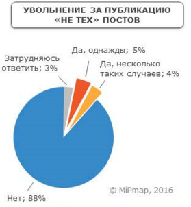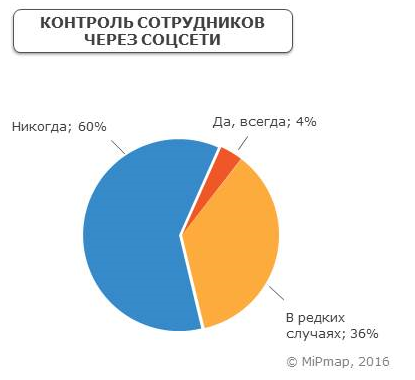 Еще больше усугубляет ситуацию то, что менеджеры среднего и высшего звена российских и иностранных компаний не только не задумываются о том, что они пишут в социальных сетях, но и не контролируют своих подчиненных. 96% респондентов заявили о том, что никогда или в очень редких случаях следят за своими подчиненными через неофициальные аккаунты в социальных сетях.