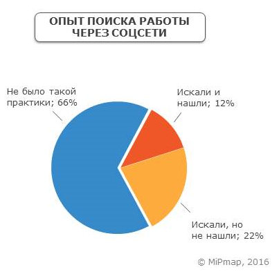 Что касается поиска работы, опрос показал, что, несмотря на разнообразие онлайн ресурсов, 66% респондентов еще ни разу не использовали их в своей практике, тогда как каждый третий, искавший работу в социальных сетях успешно достиг своей цели, что подтверждает эффективность этого канала коммуникации в решении вопроса трудоустройства.