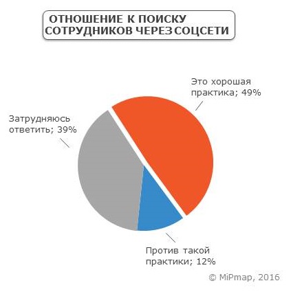 Следует подчеркнуть, что 49% респондентов позитивно настроены на поиск новых сотрудников через социальные медиа, и всего 12% из них высказались против такой практики. Полученные результаты говорят о том, что менеджеры-руководители готовы искать новых членов команды, используя онлайн ресурсы, при этом для собственного продвижения по карьерной лестнице этот инструмент используют крайне редко.