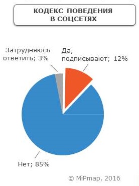 Актуальность проблемы также подтверждает тот факт, что 85% респондентов не подписывали кодекс поведения в социальных сетях при трудоустройстве, и 49% выступают категорически против регулирования работодателем их поведения онлайн.