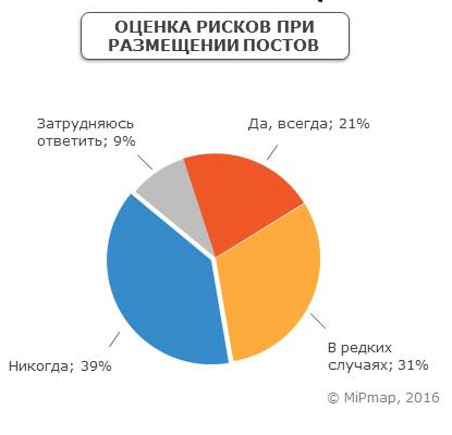 Сегодня в связи с динамичным развитием социальных сетей на первый план выходит проблема потенциальных репутационных рисков и материального ущерба, которые компании могут понести из-за некорректных высказываний и публикаций сотрудников. Согласно исследованию, вопрос регулирования этой сферы до сих пор остается открытым: преобладающее большинство респондентов никогда (39%) или лишь в исключительных случаях (31%) задумываются о реакции руководства при размещении постов в социальных сетях.