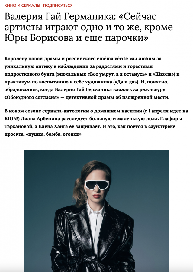1 апреля в онлайн-кинотеатре KION состоялась премьера нового сезона детективного сериала Валерии Гай Германики «Обоюдное согласие» о том, что скрывается за фасадом идеальной семьи. Проект стал первой вертикальной франшизой в России. Первый сезон вышел на платформе в 2022 году и стал хитом KION, получив также высокие оценки в СМИ и награды российских и международных премий.