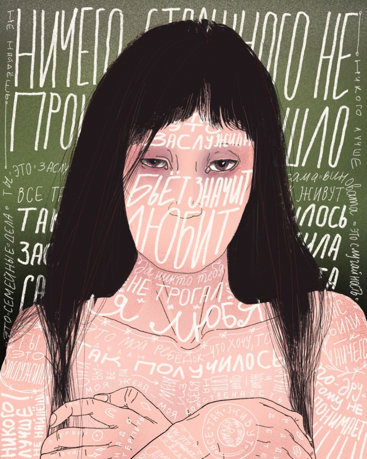 Вместе с иллюстратором Mina Milk креативная команда KION создала провокационный арт-проект — портрет девушки, состоящий из самых распространённых фраз, которыми окружающие реагируют на новости о насилии. Обесценивающие, безразличные и жестокие комментарии были собраны в рамках социологического исследования, где 2 тысячи респондентов перечисляли «аргументы», которыми принято оправдывать подобные случаи.