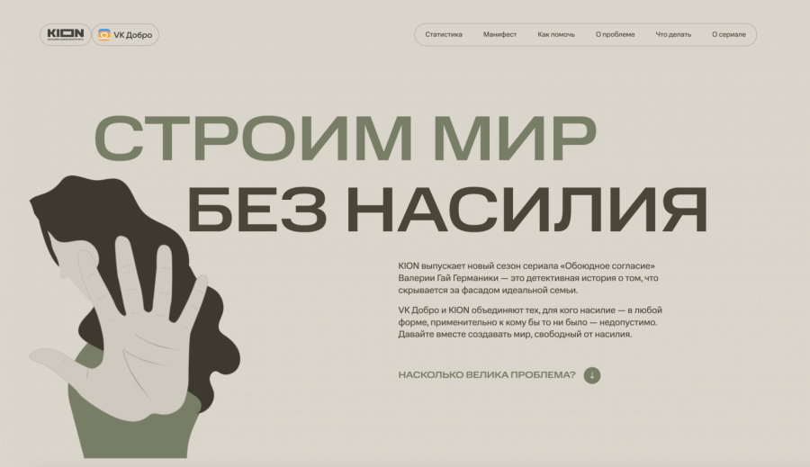 К выходу нового «Обоюдного согласия» вместе с сервисом VK Добро был также разработан специальный проект, рассказывающий о домашнем насилии бережным и понятным языком. Для этого команды KION и VK Добро провели масштабное исследование среди россиян, разобрали мифы о домашнем насилии и подготовили памятки о том, как правильно общаться с жертвами насилия. Кроме того, для пострадавших была размещена актуальная информация о том, где искать поддержку.