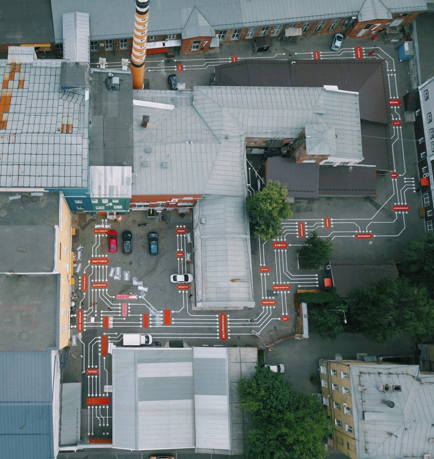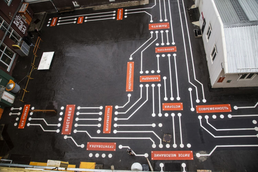 Тем не менее, пока запрос на индустриальный паблик-арт в коммерческом секторе остается сравнительно невысоким и в основном проявляется в создании временных инсталляций. Это объясняется тем, что территории большинства заводов и промышленных предприятий представляют собой закрытую экосистему, следовательно, потенциал узнаваемости проекта среди новой аудитории довольно низок. Чего нельзя сказать о паблик-арте в общественных индустриальных пространствах — он уже давно является неотъемлемой частью арт-кластеров. Один из наиболее известных кейсов в этом направлении — site-specific проект «Карта памяти» на территории ЦТИ «Фабрика», который был реализован еще в 2019 году. Появившаяся на асфальте микросхема-матрица подсветила культурный слой пространства (благодаря словам-символам, значимым для территории) и одновременно взяла на себя функции арт-навигации в сложном постиндустриальном пространстве. Подобные проекты доказывают актуальность паблик-арта для индустриальной среды, — можно смело сказать, что в течение ближайших 3−5 лет это станет трендом и для частных промышленных предприятий.