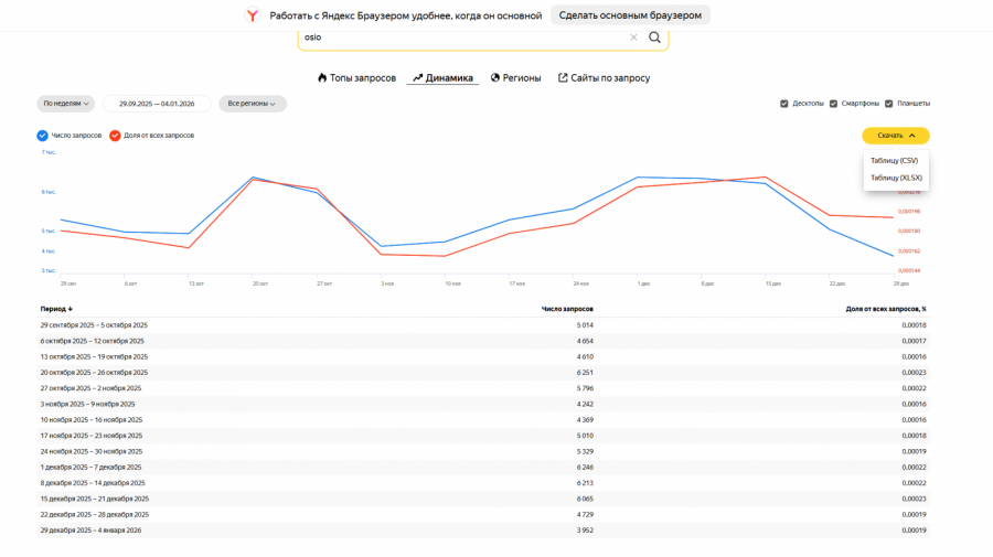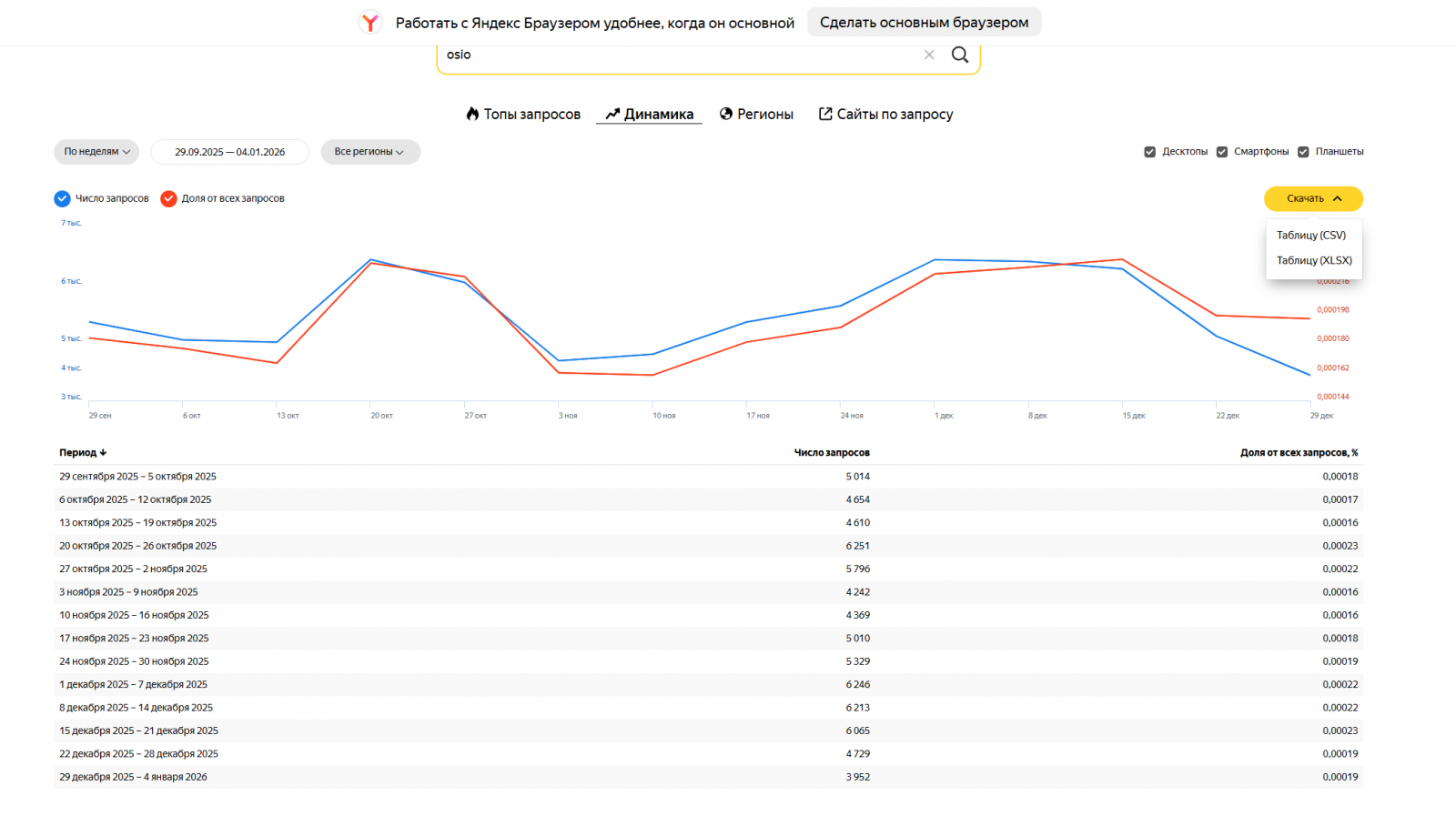 В период проведения кампании количество запросов с упоминанием бренда OSIO достигло максимальных значений за анализируемый период. Если в ноябре число запросов составляло около 4 800, то в первые две недели декабря этот показатель вырос до 6 200. Таким образом, брендовый поисковый спрос увеличился на 29% и удерживался на стабильно высоком уровне на протяжении всего периода размещения.