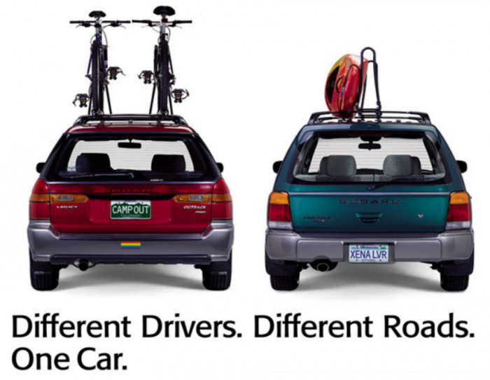 Заслужить расположение со стороны представительниц ЛГБТ-сообщества Subaru помогла рекламная кампания с изображением автомобилей с номерными знаками "Зена"(популярный сериал в середине 90-х) или "P-Town" (сокращенное название города в штате Массачусетс, считающийся центром богемной жизни). Большинство принтов выпускались под двусмысленным слоганом: "Выходи. И оставайся снаружи" (Get out. And stay out). "Каждый год мы узнавали больше о нашей аудитории. Оказалось, что им очень нравилась игра слов", - вспоминает креативный директор рекламного агентства Джон Нэш.