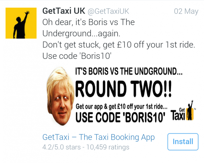 Перевод: «Вот это да! Борис (Джонсон, мэр Лондона – прим.) снова против метро. Не застряньте в дороге, получите скидку в 10 фунтов на первую поездку. Используйте код «Борис 10».
