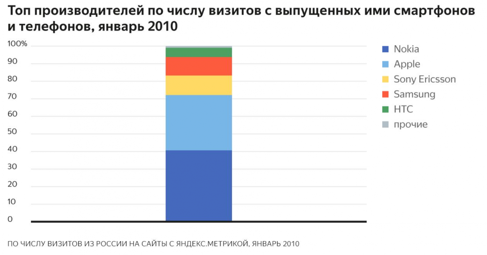 Десять лет назад около 40% мобильного трафика приходилось на устройства Nokia. Затем шли телефоны от Apple — они давали 30% трафика, а на Sony Ericsson приходилось порядка 10%.
