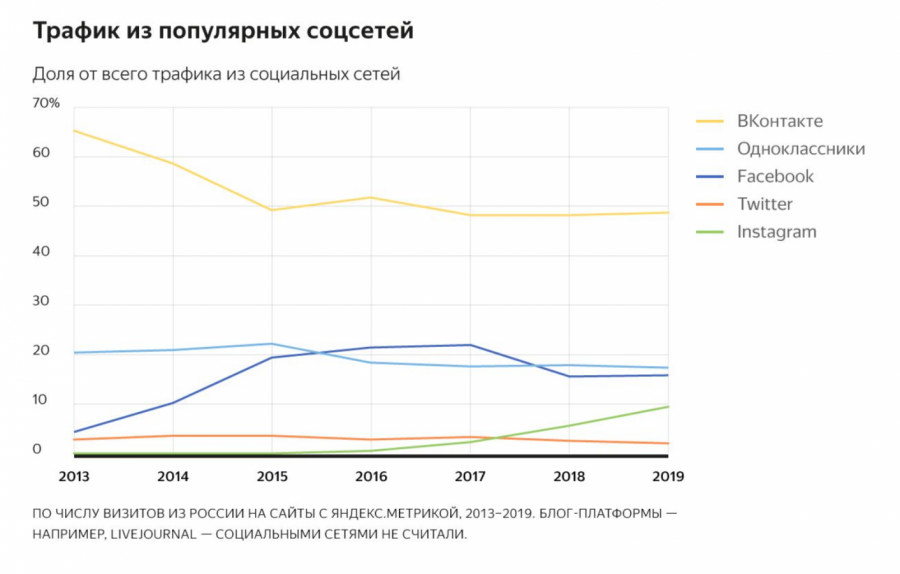 На этом графике показано, как менялись доли популярных платформ в общем объёме соцсетевого трафика. Доля «ВКонтакте» уменьшилась. Это связано с тем, что социальных сетей в принципе стало больше.