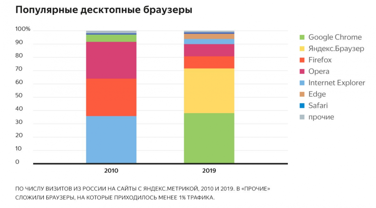 В 2019 году Рунет уже не тот. Теперь лидирует Google Chrome, а следом за ним «Яндекс.Баузер» — на них приходится три четверти всех визитов. Opera и Firefox по-прежнему идут наравне, но теперь на них приходится лишь по 9% визитов. Кто-то еще пользуется старым-добрым Internet Explorer — в 2019 его доля составила 4%. Примерно столько же у браузера Edge, который пришел ему на смену. Созданный компанией Apple браузер Safari обеспечил около 1−2% визитов в 2019 году.