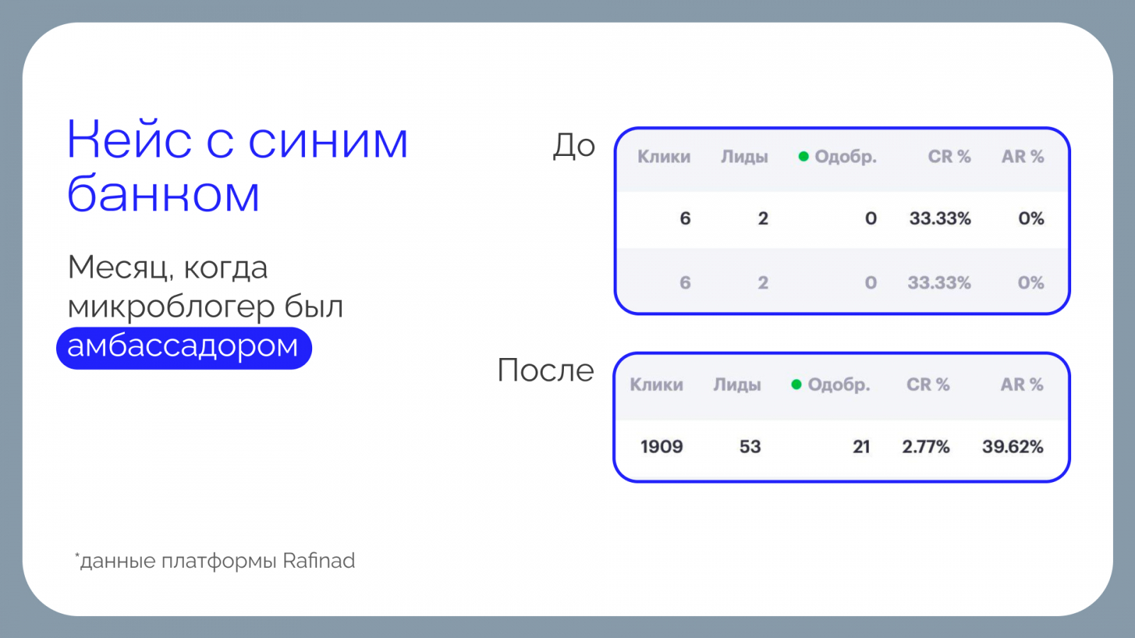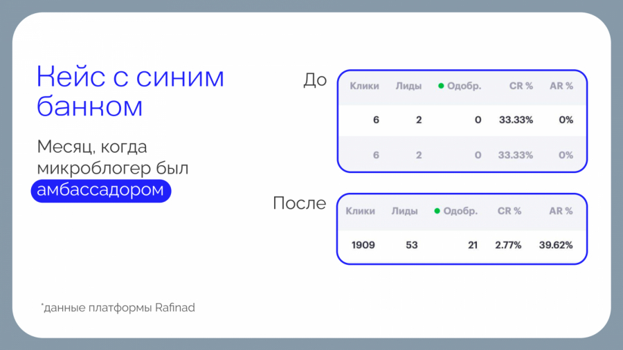 По итогам тестового периода микроамбассадорства банк получил кратный рост ключевых метрик уже в первый месяц после подключения блогера. Количество кликов увеличилось с 6 до 1 909 (+31 717%, рост в 318 раз), лидов — с 2 до 53 (+2 550%, рост в 26,5 раз).