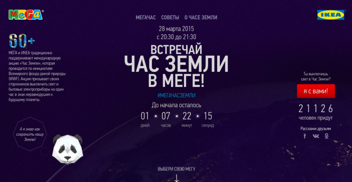 Об экологии задумались и российские ритейлеры ИКЕА и МЕГА, которые запустили к Часу Земли большую информационную кампанию. С 20:30 по местному времени во всех торговых центрах МЕГА на один час будет отключен свет рекламной башни, баннеров на фасаде и на парковках, а также приглушен свет в некоторых торговых галереях. Кроме того, во всех магазинах состоятся разнообразные мероприятия – конкурсы и флешмобы для посетителей.