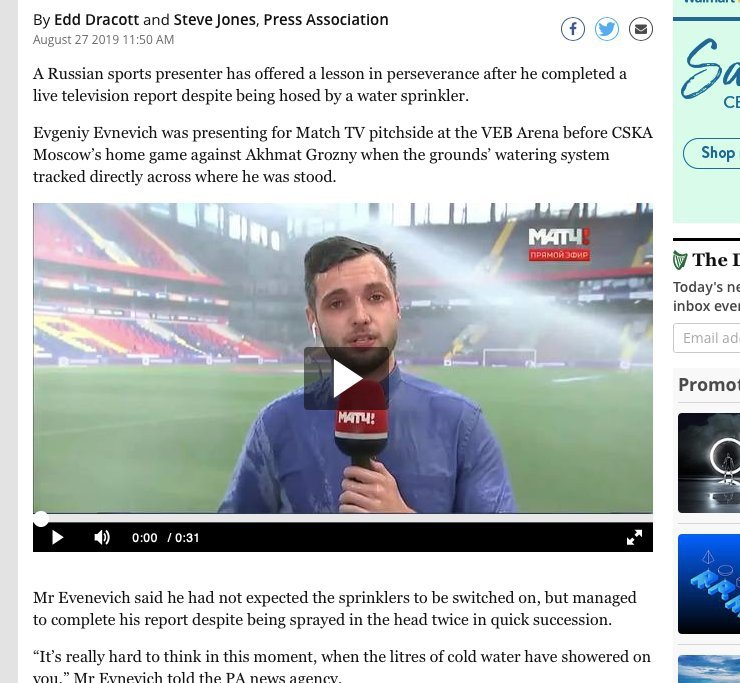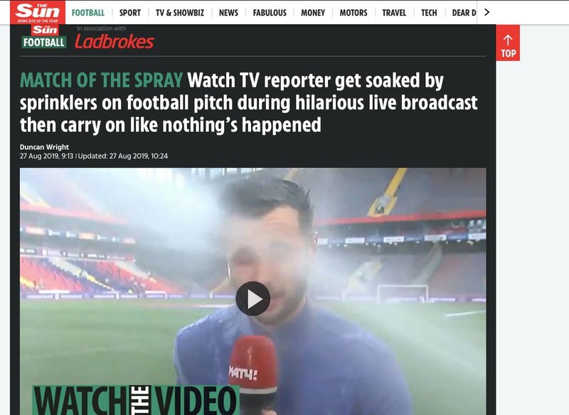 Несколько дней назад перед матчем ЦСКА — Ахмат с корреспондентом «Матч ТВ» Евгением Евневичем, работающим в прямом эфире, случился казус — он попал под полив газона. Журналист, ни капли не смутившись, продолжил репортаж. Это минутное происшествие обеспечило Евневичу колоссальную популярность.