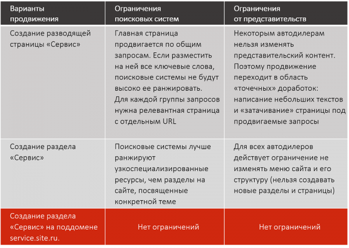 Есть ли альтернативы? Для принятия окончательного решения предлагаем сравнительную таблицу по различным форматам представления сервисных услуг на сайте автодилера. Она основана на опыте работы специалистов Ingate над проектами автомобильной тематики.
