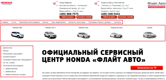 1. Созданы новые меню: главное (предлагает ознакомиться с услугами, бонусными программами, спецпредложениями и т. д.), модельное (позволяет перейти на страницу конкретного автомобиля, к примеру, Honda Pilot, Honda CR-V, Honda Civic, Honda Accord, Acura), левое («заточено» под наиболее запрашиваемые услуги сервиса: диагностика, техосмотр, ремонт, техобслуживание и др.).
