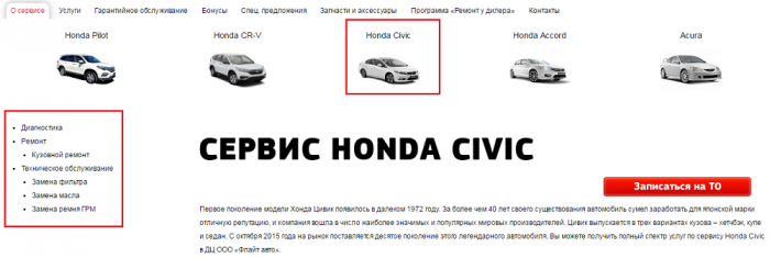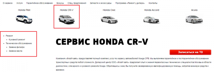 2. Главная страница продвигается по запросам «сервис хонда», «сервисное обслуживание хонда» и пр. Подразделы левого меню – по запросам «то хонда», «диагностика хонда», «замена фильтра хонда» и т. д.