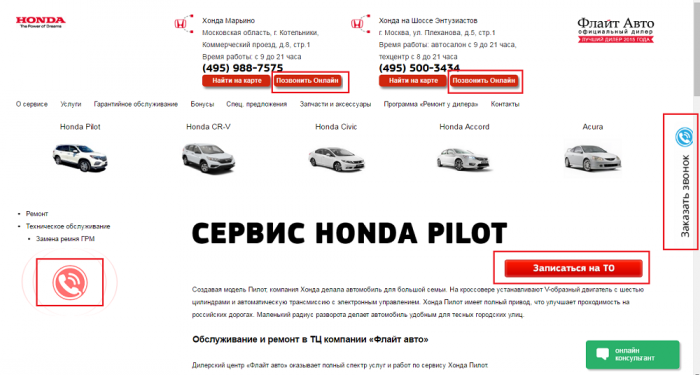 6. На посадочных страницах реализованы конверсионные элементы для заказа услуг: «Позвонить онлайн», «Записаться на ТО», «Заказать звонок».