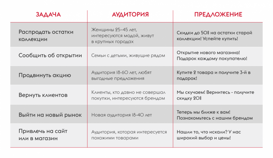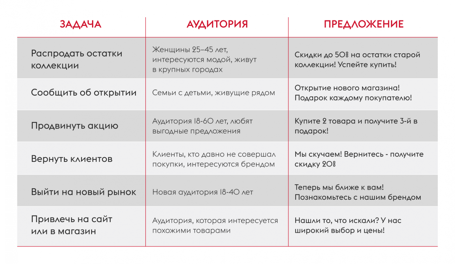 - Какую задачу вы хотите решить с помощью рекламы? Продажи, привлечение, открытие, возврат клиентов — определитесь с задачей.