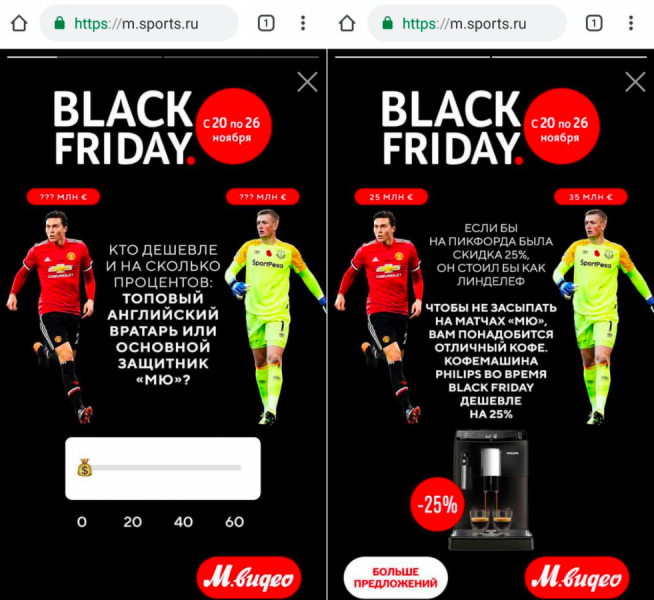 Кроме того, на втором шаге пользователя дополнительно привлекали остроумной репликой, которая связывала товар и футбол. Например, когда через разницу в стоимости защитника английской команды «Манчестер Юнайтед» Виктора Линделефа и вратаря «Эвертона» Джордана Пикфорда анонсировали 25-процентную скидку на кофемашину, шутили о том, насколько неинтересно в последнее время смотреть матчи суперпопулярного клуба из Манчестера: «Чтобы не засыпать на матчах «МЮ», вам понадобится отличный кофе».
