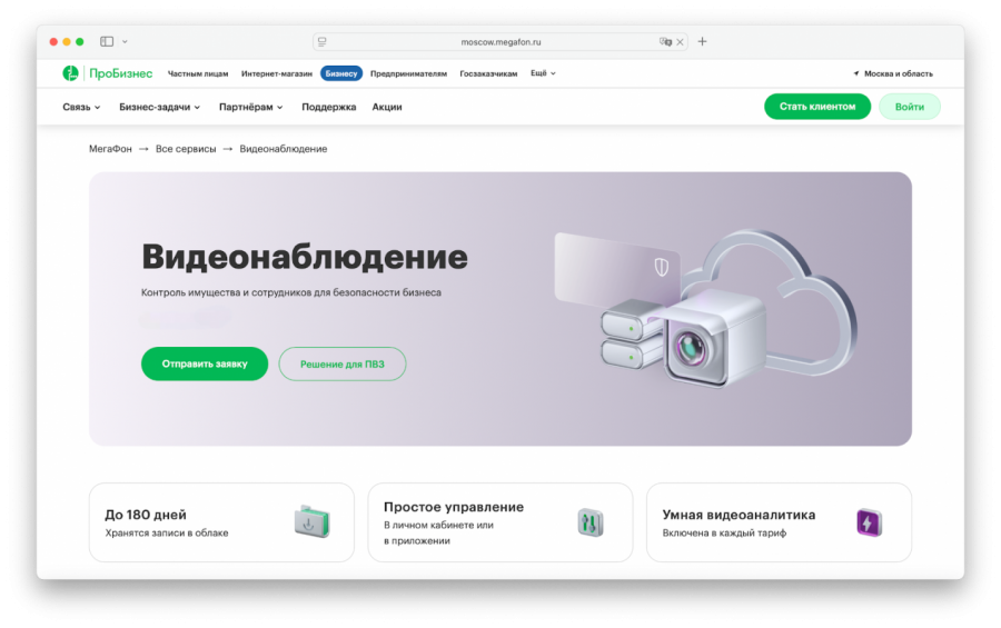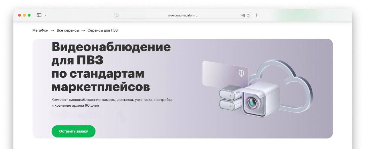 На первый экран посадочной страницы сервиса видеонаблюдения для бизнеса добавили кнопку «Решение для ПВЗ».
