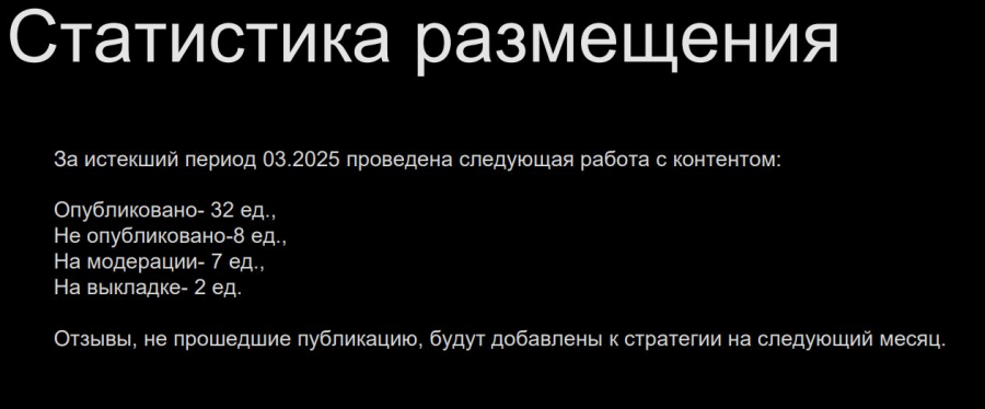 В случае с SERM это не только медиаплан, но и подробная статистика по отзывам: сколько было размещено, сколько не прошло модерацию, сколько еще в работе.