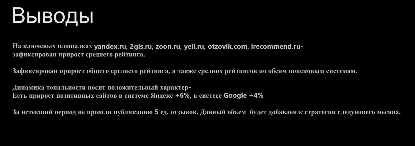- Что было сделано для решения задачи клиента. В первой части отчета — конкретный перечень действий агентства: какие площадки обрабатывались, сколько отзывов проработано, какие направления мониторились и так далее. Без воды — только суть.
