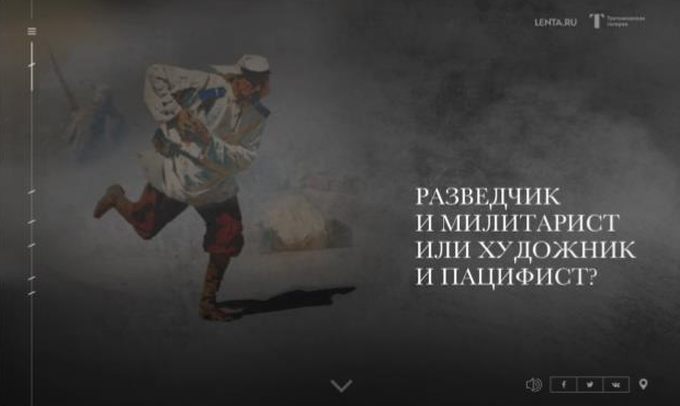 Директор департамента визуальных коммуникаций Rambler Group Владислав Тютюников рассказал Sostav о совместном с Лентой.ру и Третьяковской галереей специальном мультимедийном проекте «Бунтарь. Завоеватель. Революционер». Он посвящен одноименной выставке художника Василия Верещагина, которая проходит в Третьяковской Галерее на Крымском валу до 15 июля. Проект нацелен на молодую аудиторию и вмещает различные средства мультимедийного сторителлинга.