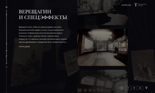 Трудно оценивать, как коллеги отразили биографию и творчество Верещагина в этом проекте: для это нужно быть искусствоведом. Но с технической точки зрения проект не простой, однако и инновационным его не назовешь, основной интерактив построен на эффекте параллакса. Мне понравился графический контент, как были встроены в визуальный ряд картины. А вот видео вставка вызвала больше улыбку, некоторые образы показались не такими глубокими, как предполагает концепция. В итоге графический контент вовлекает в процесс, а вот содержание не «цепляет», плохо поработали над интеграцией смысла.