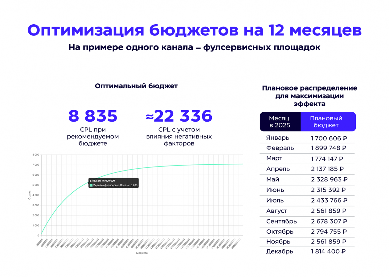 На основе построенной модели с учетом AdStock — отложенного влияния на конверсии — были построены графики предельной отдачи по каналам в Tamburin. В результате мы сформировали прогноз на 2025 год с предельными максимально эффективными бюджетами.