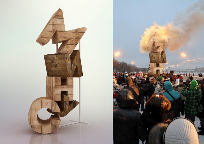 Следующая история была сезонная. В Парке Горького сложилась замечательная традиция праздновать Масленицу и провожать зиму. В парке устанавливается масленичный арт-объект от современного скульптора или дизайнера, который торжественно сжигают в конце праздника. Мы разработали оформление входной группы в оба парка.