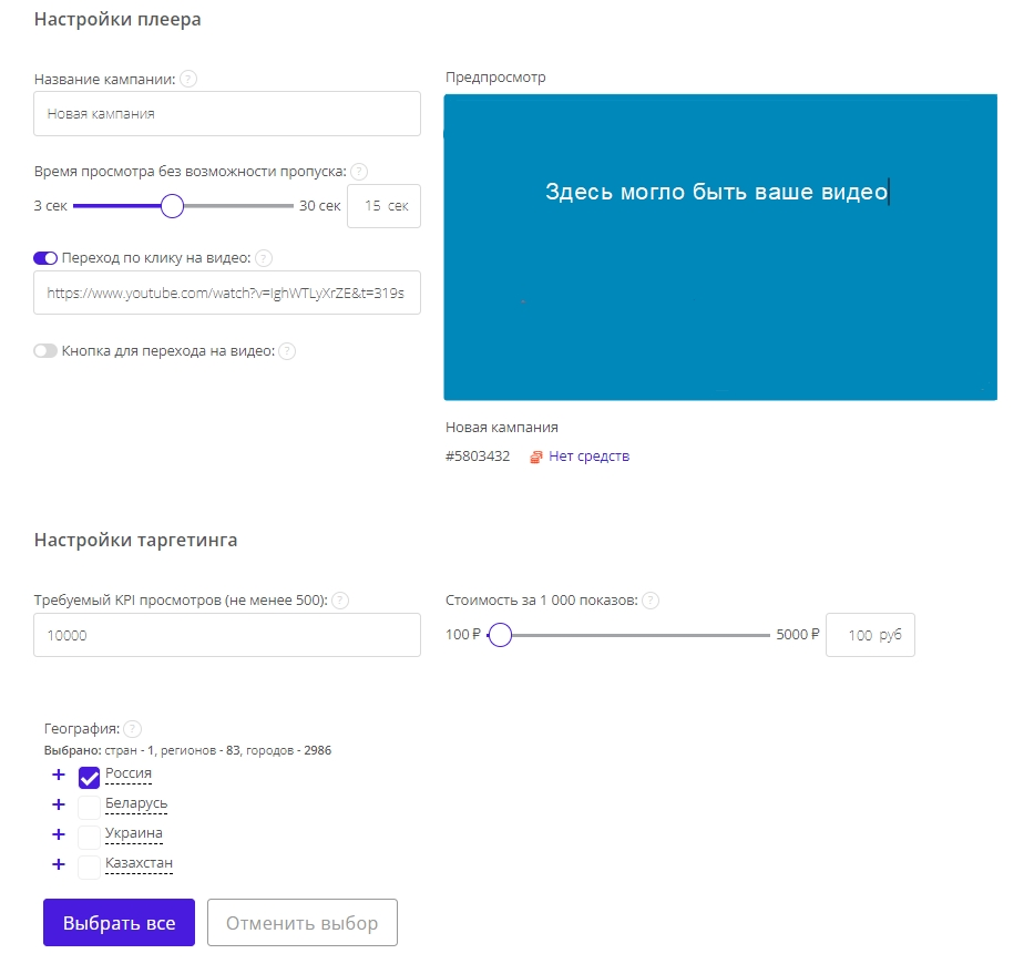 Функционал автоматического запуска рекламы Rutube-роликов появится в личных кабинетах наших пользователей в ближайшее время. Настройки практически ничем не отличаются от примера выше. Разница лишь на первом шаге — вместо загрузки видеоролика, рекламодатель вставляет ссылку на уже размещённое на Rutube видео. А дальше стандартные шаги: указать необходимое количество просмотров, выставить стоимость за 1 000 показов, выбрать нужно геоположение аудитории.