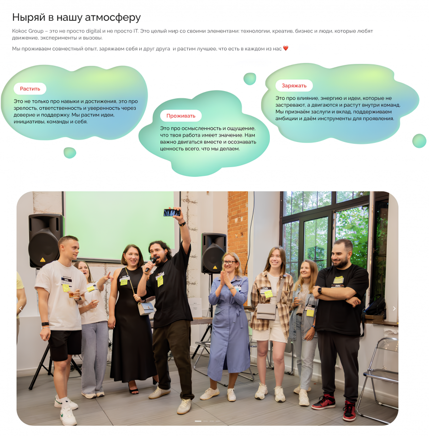 Важной частью общего вектора стал и карьерный сайт. В Kokoc Group перестали смотреть на него как на витрину вакансий и превратили в полноценную HR-платформу — первый этап воронки, где команда честно показывает будущим сотрудникам, куда они приходят: не идеальную картинку, а реальную среду со своим ритмом, требованиями и возможностями роста.