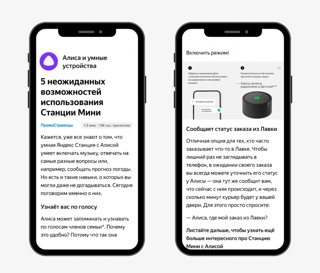 Содержание. В статье важно помочь читателю разобраться в продукте — например, сделать инструкцию. «Яндекс» с помощью картинок объяснил, как включить режим радионяни и настроить колонку, чтобы она запомнила голоса жильцов. Так пользователь видит, как работает устройство.