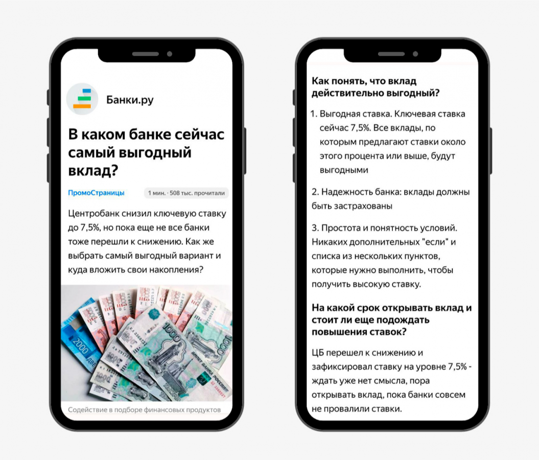 Содержание. В заголовке «Банки.Ру» использовал триггер получения выгоды и в статье последовательно ответил на вопросы, которые волнуют аудиторию. Сначала компания объяснила, как понять, что вложения окупятся, на какой срок открыть вклад и стоит ли ждать повышения ставок. А в конце рассказала, как и куда внести деньги. Главные тезисы команда «Банки.Ру» вынесла в подзаголовки разделов — так пользователи могли сразу увидеть нужную информацию.