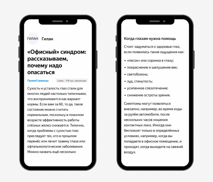Содержание. В «ПромоСтраницах» можно работать с аудиторией по всей воронке продаж: от создания спроса до отложенных конверсий. Компания «Гилан» ориентировалась на пользователей, у которых ещё не сформирована потребность в увлажняющих каплях. Сначала она рассказала в статье, почему возникает сухость глаз и какие есть симптомы, а потом предложила продукт как решение проблемы.