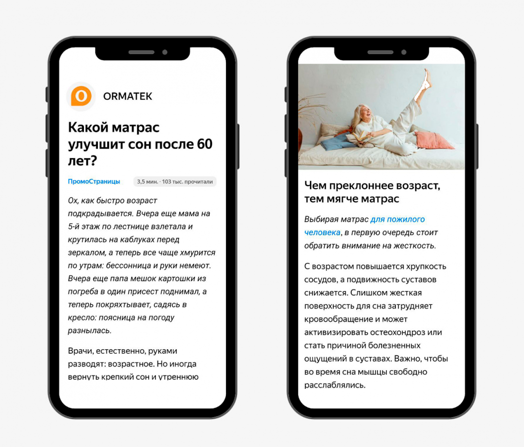 Содержание. В «ПромоСтраницах» важно обозначить нужную аудиторию уже в заголовке. Например, Ormatek в статье «Какой матрас улучшит сон после 60 лет?» выделяет пользователей по возрасту. Поэтому в статью приходят те, кто заинтересован в продукте, — пожилые люди или родственники, которые выбирают для них матрас.