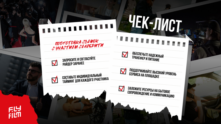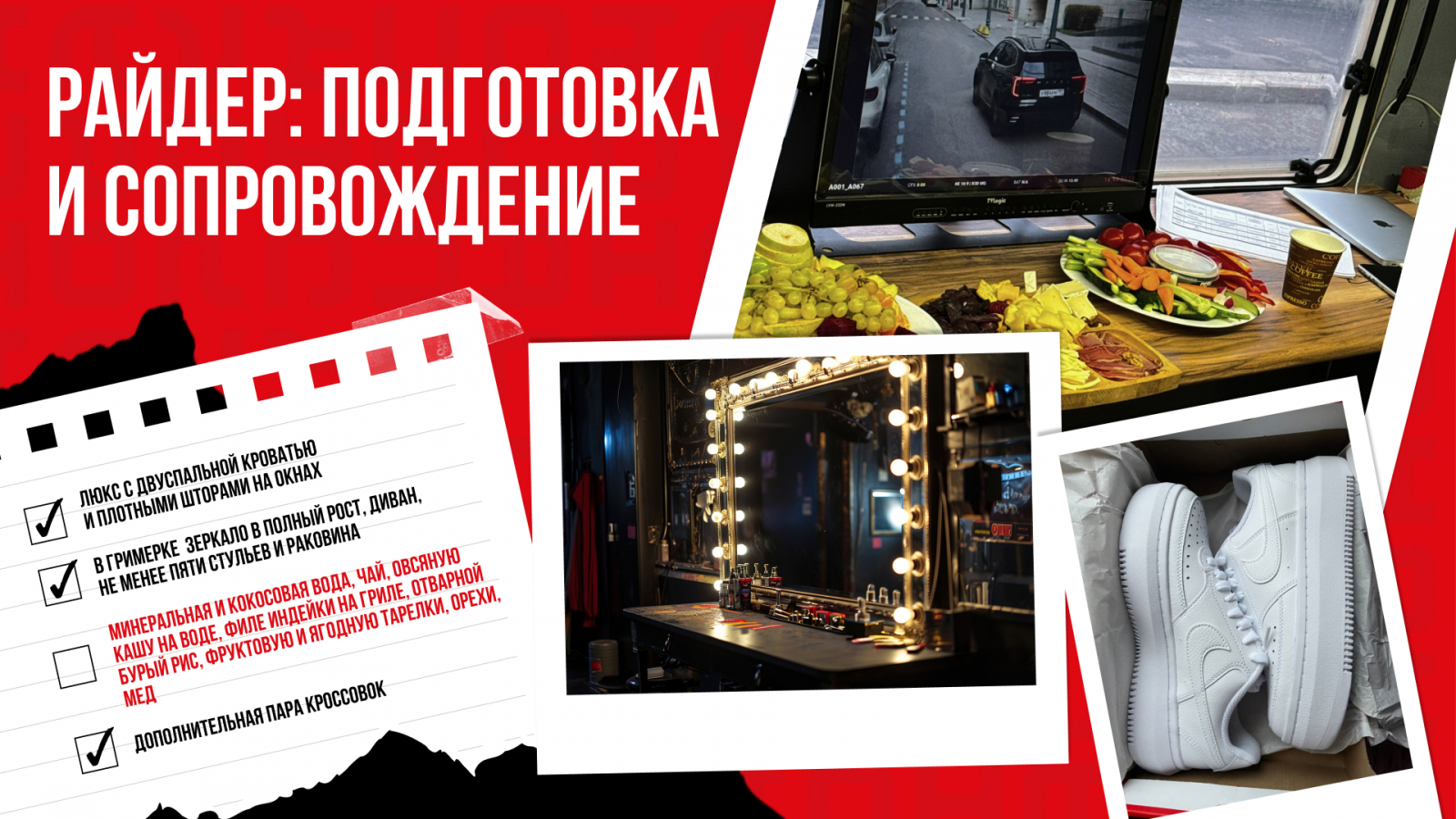 Когда в проекте участвует публичная личность, продакшен обязан заранее запросить у ее представителей детальный райдер. В нем обычно перечислены требования к составу специалистов (визажисты, парикмахеры, костюмеры), условиям на площадке, организации трансфера, питанию и бытовому сервису. Этот документ помогает согласовать ожидания сторон и заранее структурировать рабочий процесс.
