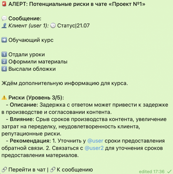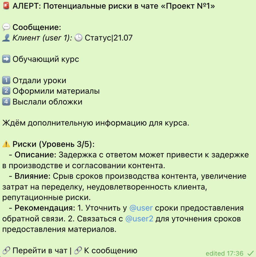Если клиент чем-то недоволен, сервис пишет проектному директору с советами, как разрешить конфликт. При этом бот оценивает риски для бизнеса. Например, «срыв сроков производства контента», «увеличение затрат на переделку», «неудовлетворенность клиента», «репутационные риски». Получив такое уведомление, руководитель оперативно вмешивается и отправляет рекомендации менеджеру, отвечающему за проект.