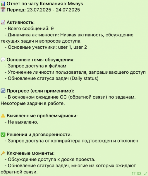 Система также собирает общую аналитику по каждому чату. Она показывает, сколько было позитивных, нейтральных и негативных сообщений, и как быстро отвечает каждый участник переписки. Раз в неделю проектный директор получает отчет: какие темы обсуждали, что изменилось в проекте, какие появились риски и какие решения приняты.